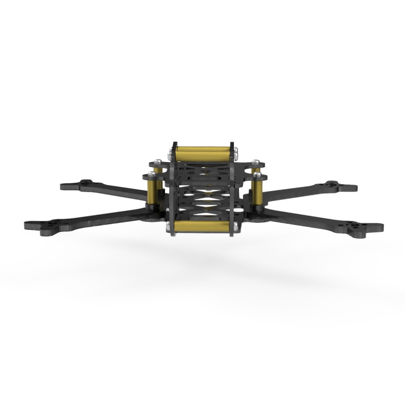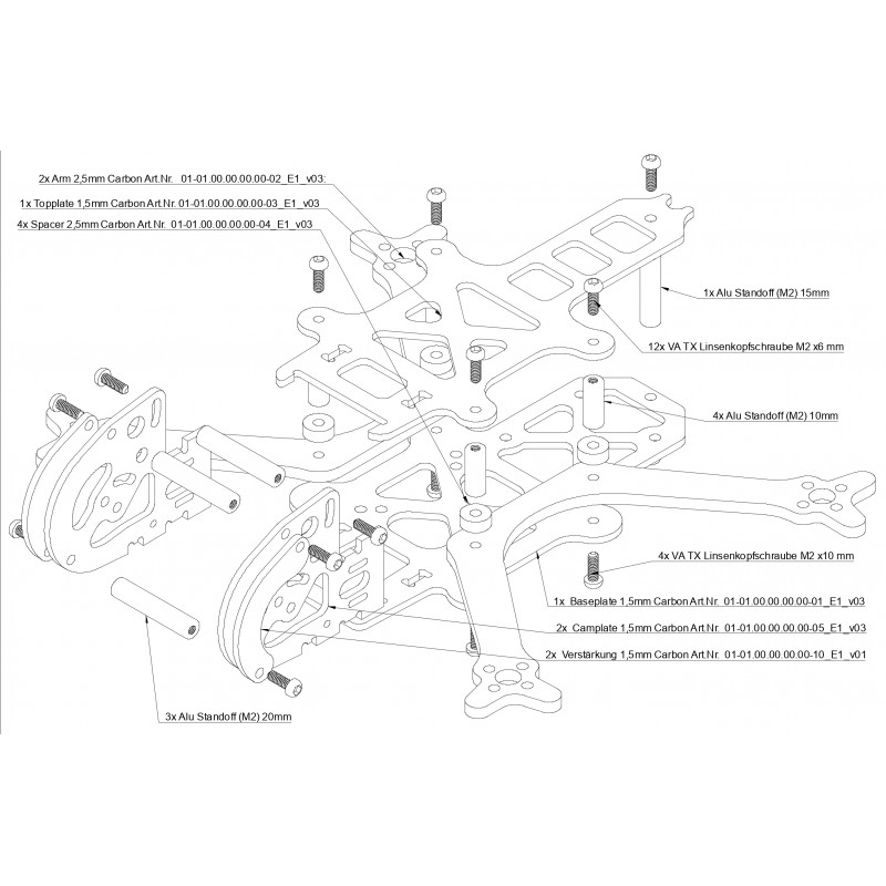1x Baseplate 1,5 mm Carbon; 2x Doppelarm 2,5 mm Carbon; 4x Spacer 2,5 mm Carbon; 1x Topplate 1,5 mm Carbon;